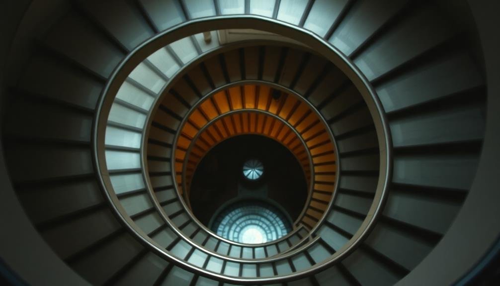 While low-angle shots can create vertigo effects, tilting your horizon line offers another powerful tool for disorienting viewers. By deliberately skewing the horizontal plane, you'll challenge your audience's perception of balance and stability. This technique works particularly well in urban environments, where straight lines and right angles are abundant.